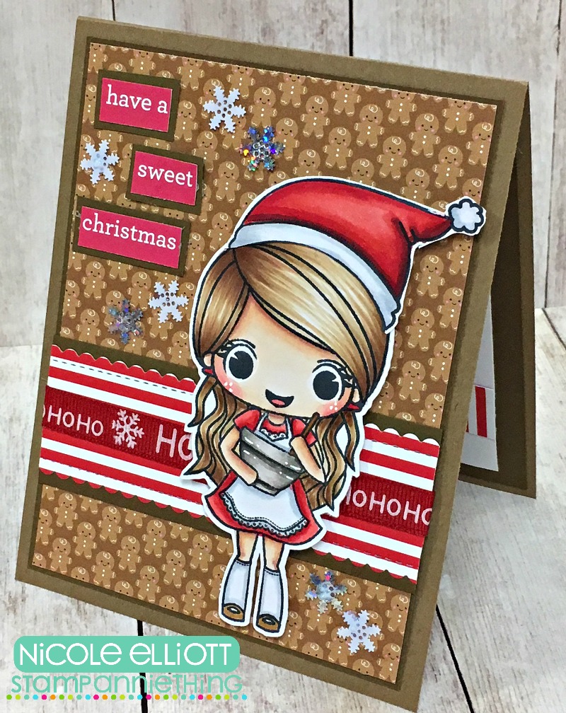 I used two different stamp images for my card. I used "Felicity - What's Cooking?" for my girl. I then used the santa hat from "Paige - Holiday Magic". My paper is from Doodlebug and I also used a sentiment from the same paper pad and cut it apart. I finished it up with some snowflake sequins.